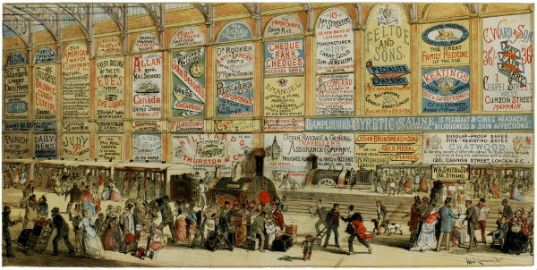 MODERN ADVERTISING: A RAILWAY STATION IN 1874.