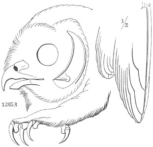 As regards their plumage, the Owls differ most remarkably from the Hawks in the fact that the sexes are invariably colored alike, while from the nest to perfect maturity there are no well-marked progressive stages distinguishing the different ages of a species. The nestling, or downy, plumage, however, of many species, has the intricate pencilling of the adult dress replaced by a simple transverse barring upon the imperfect downy covering. The downy young of Nyctea scandiaca is plain sooty-brown, and that of Strix flammea immaculate white.