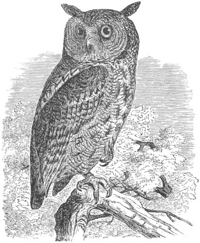 In their distribution, the Owls, as a family, are cosmopolitan, and most of the genera are found on both hemispheres. All the northern genera (Nyctea, Surnia, Nyctale, and Scotiaptex), and the majority of their species, are circumpolar. The genus Glaucidium is most largely developed within the tropics, and has numerous species in both hemispheres. Otus brachyotus and Strix flammea are the only two species which are found all over the world,—the former, however, being apparently absent in Australia. Gymnoglaux, Speotyto, Micrathene, and Lophostrix are about the only well-characterized genera peculiar to America. Athene, Ketupa, and Phodilus are peculiar to the Old World. The approximate number of known species (see Gray’s Hand List of Birds, I, 1869) is about two hundred, of which two, as stated, are cosmopolitan; six others (Surnia ulula, Nyctea scandiaca, Glaucidium passerinum, Syrnium cinereum, Otus vulgaris, and Nyctale tengmalmi) are found in both halves of the Northern Hemisphere; of the remainder there are about an equal number peculiar to America and the Old World.