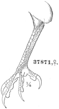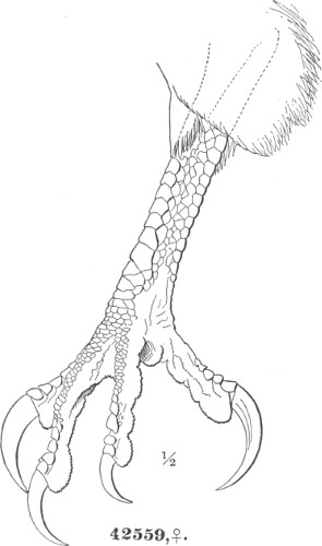 Measurements.—♂. Wing, 23.80–24.30; tail, 14.00–14.50; culmen, 1.68–1.70; tarsus, 3.40; middle toe, 2.40–2.45. Specimens, 2. ♀. Wing, 25.00–25.50; tail, 14.00–14.50; culmen, 1.80–1.85; tarsus, 3.80–4.10; middle toe, 2.85–3.10. Specimens, 3.