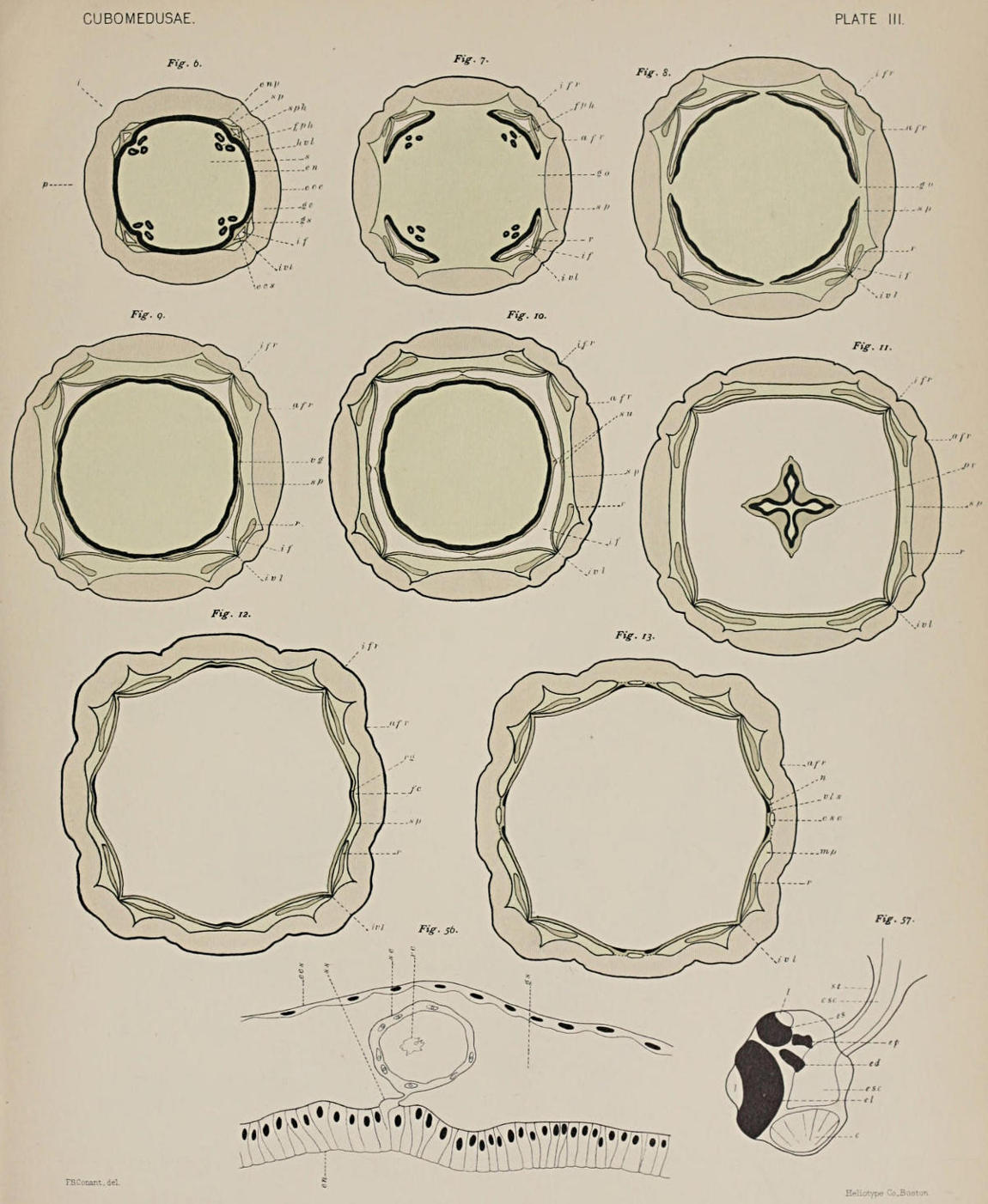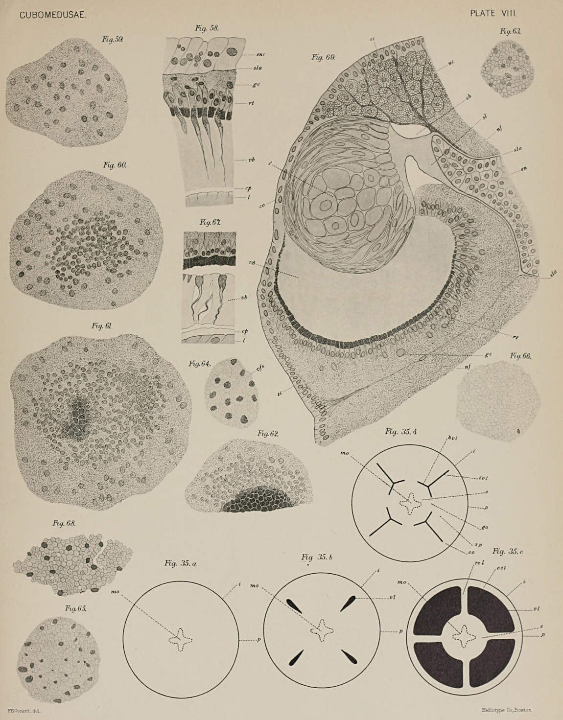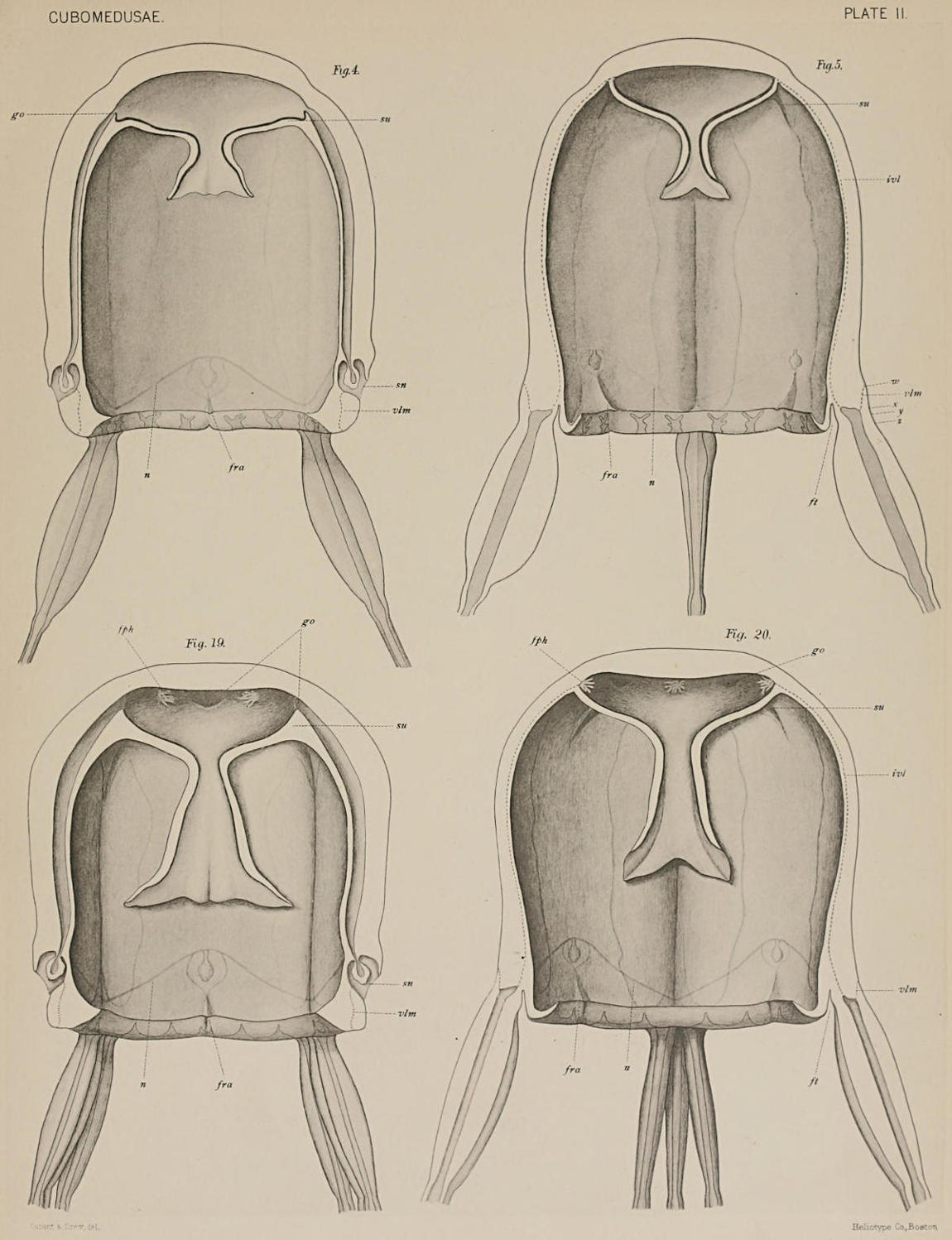 Haeckel’s treatment of the Cubomedusæ in his “System” (’79) in the Challenger Report (’81) is much more lucid than Claus’s; but the extended scope of his work and the imperfect preservation of his material prevented a detailed investigation, and for a more complete and readily intelligible[2] account of the structure of the Cubomedusæ a larger number of figures is desirable.