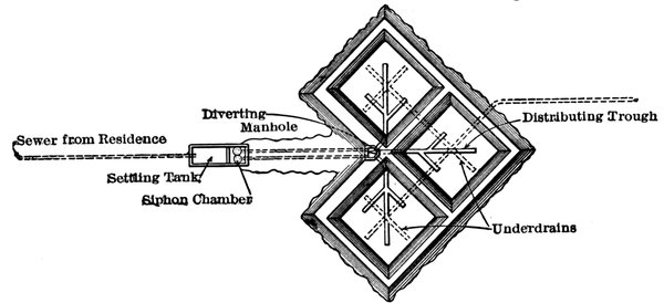 Cesspools have been considered the only way of caring for sewage in places where a running stream was not available, or where attempts were made to protect such a stream from pollution, and while, in these last few years, crude attempts have been made to utilize the so-called septic tank, such attempts have generally been so unintelligent that the results have been anything but satisfactory. Since it has been understood that insects, such as flies and mosquitoes, play an important part 2in the transmission of disease, the danger of overflowing cesspools and of open ditches in which stagnant sewage is present, has been appreciated; also the higher standards of living which have made themselves felt throughout the rural community have demanded in farm-houses and country homes sanitary conveniences which have hitherto been wanting.