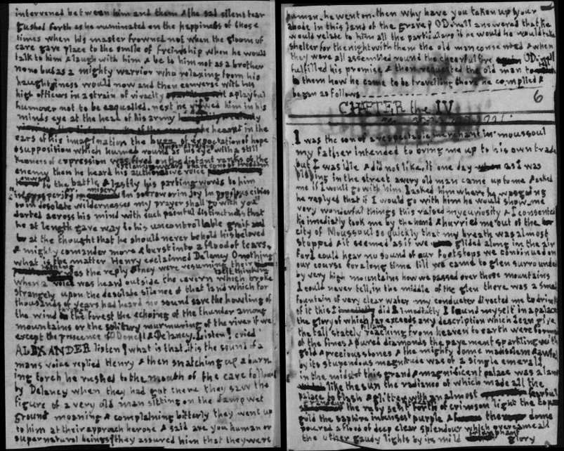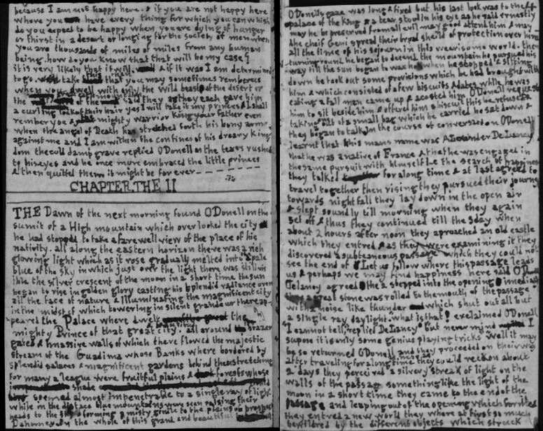 THE Dawn of the next morning found O'Donell on the sumit of a High mountain which overlooked the city he had stopped to take a farewell view of the place of his nativity. all along the eastern horizon there was a rich glowing light which as it rose gradually melted into the pale blue of the sky in which just over the light there was still visible the silver crescent of the moon in a short time the sun began to rise in golden glory casting his splendid radiance over all the face of nature and illuminating the magnificent city in the midst of which towering in silent grandeur there appeared the Palace where dwelt the mighty Prince of that great and beautiful city. all around the brazen gates and massive walls of which there flowed the majestic stream of the Guadima whose Banks where bordered by splendid palaces and magnificent gardens behind these stretching for many a league were fruitful plains and forests whose shade seemed almost impenetrable to a single ray of light while in the distace blue mountains were seen raising their heads to the sky and forming a misty girdle to the plains of Dahomey. on the whole of this grand and beautiful prospect |[4]| O'Donells gaze was long and fixed but his last look was to the palace of the King and a tear stood in his eye as he said ernestly may he be preserved from all evil may good attend him and may the cheif Geni spread their broad sheild of protection over him all the time of his sojourn in this wearisome world. then turning round he began to decend the mountain he pursued his way till the sun began to wax hot when he stopped and sitting down he took out some provisions which he had brought with him and which consisted of a few biscuits and dates while he was eating a tall man came up and acosted him O'Donell requested him to sit beside him and offered him a biscuit this he refused and taking one out of a small bag which he carried he sat down and they began to talk. In the course of conversation O'Donell learnt that this mans name was ALexander DeLancy that he was a native of France and that he was engaged in the same pursuit with himself i-e the search of happiness they talked for along time and at last agreed to travel together then rising they pursued their journey towards night fall they lay down in the open air and slept soundly till morning when they again set off and thus they continued till the 3 day when about 2 hours after noon they aproached an old castle which they entred and as they were examining it they discovered a subteaneous passage which they could not see the end of Let us follow where this passage leads us and perhaps we may find happiness here said O'Donell Delancy agreed the 2 stepped into the opening imediately they a great stone was rolled to the mouth of the passage with a noise like thunder which shut out all but a single ray daylight. "What is that! exclaimed O'Donell "I cannot tell," replied DeLancy "but never mind I supose it is only some genius playing tricks" "Well it may be so returned O'Donell and they proceeded on their way after traveling for a long time as near as they could reckon about 2 days they perceived a silvery streak of light on the walls of the passage something like the light of the moon in a short time they came to the end of the passage and leaping out of the opening which formed they entred a new world they where at first so much bewildred by the different objects which struck their senses that they almost fainted but at length recovering they had time to see every thing around them they were upon the top of a rock which was more than a thousand fathoms high, all beneath them was liquid Mountains tossed to and fro with horrible confusion roaring and raging with a tremendous noise and crowned with waves of foam all above them was a mighty firmament in one part covere with black clouds from which darted huge and terrible sheets of Lightning in another part an imense globe of Light like silver was hanging in the sky and several smaller globes which spakled exceedingly surounded it. in a short time the tempest which was dreadful beyond description ceased the large black clouds cleared away the silver globes vanished and another globe whose light was of a gold colour appeared it was far larger than the former and in a little time it became so intensely bright that they could no longer gaze on it so after looking around them for some time they rose and pursued their journey. they had travelled a long way when they came an imense forest the trees of which bore a large fruit of a deep purple colour of which they tasted and found that it was fit for food, they journeyed in this forest for three days and on the 3 day they entred a valley or rather a deep glen surounded on each side by tremendous rocks whose tops where lost in the clouds in this glen they continued for some time and at last came in sight of a mountain which rose so high that the could not see the sumit though the sky was quite clear. at the foot of the mountain there flowed a river of pure water border by trees which had flowers of a beautiful rose coulour except these trees nothing was to be seen but black forests and huge rocks rising out of a wilderness which bore the terrible aspect of devastation and which stretched as far as the eye could reach in this desolate land no sound was to be heard, not even cry of the eagle or the scream of the Curlew but a silence like the silence of the grave reigned over all the face of nature unbroken except by the murmur of the river as it slowly wound its course through the desert