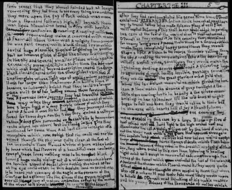 after they had contemplated this scene for some time O'Donell exclaimed "ALEXANDER Let us abide here what need have we to travel father let us make this our place of rest"! "We will" replied DeLancy and "this shall be our abode" added he pointing to a cave at the foot of the mountaine "It shall" returned—O'Donell as they entered it. in this country they remained for many long years and passed their time in a maner which made them completely happy sometimes they would sit upon a high rock and listen to the hoarse thunder rolling through the sky and making the mountains to echo and the deserts to ring with its awful voice, somtimes they would watch the lightning darting across black clouds and shivering huge fragments of rock in its terrible passage sometimes they would witness the great glorious orb of gold sink behind the far distant mountains which girded the horizon and then watch the advance of grey twilight and the little stars coming forth in beauty and the silver moon arising in her splendour till the cold dews of night began to fall and then they would retire to their bed in the cave with hearts full of joy and thankfulness. one evening they were seated in this cave by a large Blazing fire of turf which cast its lurid light to the high arched roof and illuminated the tall and stately pillars cut by the hand of nature out the stony rock with a cheerful and red glare that appeared strange in this desolate land which no fires had ever before visited except those feirce flames of death which flash from the heavens when robed in the dreadful majesty of thunder. they were seated in this cave then listening to the howling night wind as it swept in mournful cadences through the trees of the forest which encircled the foot of the mount and bordered the stream which flowed round it. they were quite silent and their thoughts were ocupied by those that were afar off and whom it was their fate most likely never more to behold O'Donell was thinking of his noble master and his young Princes of the thousands of miles which intervened between him and them and the sad silent tear gushed forth as he ruminated on the happiness of those times when his master frowned not when the gloom of care gave place to the smile of freindship when he would talk to him and laugh with him and be to him not as a brother no no but as a mighty warrior who relaxing from his haughtiness would now and then converse with his high officers in a strain of vivacity and playful humour not to be equalled. next he viewed him in his minds eye at the head of his army he heared in the ears of his imagination the buzz of expectation of hope and supposition which humed round him as his penetrating eye with a still keeness of expression was fixed on the distant ranks of the enemy then he heard his authorative voice exclam, Onward brave sons of freedom onward to the battle and lastly his parting words to him "in prosperity or, in misery In sorrow or in joy In populous cities or in desolate wildernesses my prayer shall go with you" darted across his mind with such painful distinctness that he at length gave way to his uncontrollable greif at the thought that he should never behold his beloved and mighty comander more and burst into a flood of tears. What is the matter Henry exclaimed Delancy O nothing nothing was the reply and they were resuming their tacit thinking when a voice was heard outside the cavern which broke strangely upon the desolate silence of that land which for thousands of years had heard no sound save the howling of the wind through the forest the echoing of the thunder among mountains or the solitary murmuring of the river if we except the preseence of O'Donell and Delancy. Listen! cried ALEXANDER listen! what is that. it is the sound of a mans voice replied Henry and then snatching up a burning torch he rushed to the mouth of the cave followed by Delancy when they had got there they saw the figure of a very old man sitting on the damp wet ground moaning and complaining bitterly they went up to him at their approach he rose and said are you human or supernatural beings? they assured him that they were human. he went on. then why have you taken up your abode in this land of the grave? O'Donell answered that he would relate to him all the particulars if he would he would take shelter for the night with them the old man consented and when they were all assembled round the cheerful fire O'Donell fulfilled his promise and then requested the old man to tell them how he came to be travelling there he complied and began as follows——
