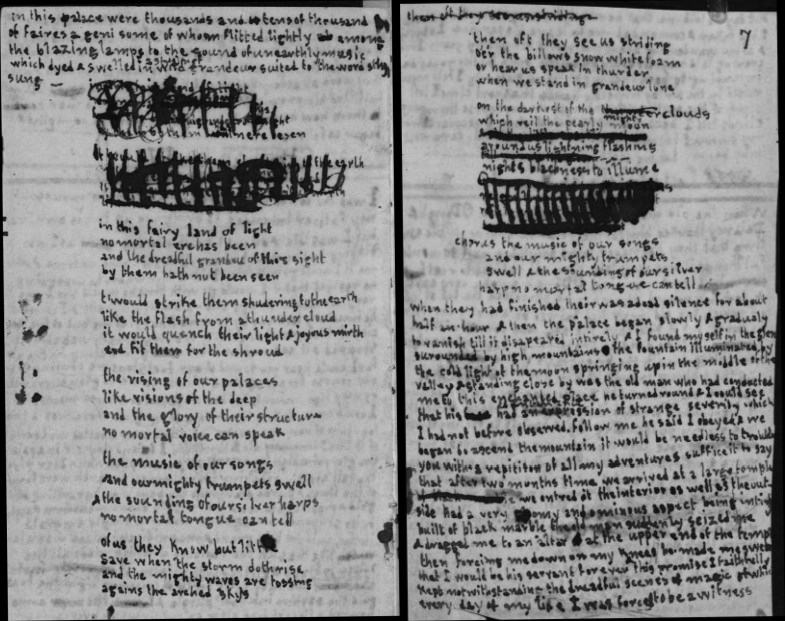 when they had finished their was a dead silence for about half an hour and then the palace began slowly and gradualy to vanish till it disapeared intirely and I found myself in the glen surounded by high mountains the fountain illuminated by the cold light of the moon springing up in the middle of the valley and standing close by was the old man who had conducted me to this enchanted place he turned round and I could see that his countenance had an expression of strange severity which I had not before observed. Follow me he said I obeyed and we began to ascend the mountain it would be needless to trouble you with a repititon of all my adventures suffice it to say that after two months time we arrived at a large temple we entred it the interior as well as the outside had a very gloomy and ominous aspect being intirely built of black marble the old man suddenly seized me and dragged me to an altar at the upper end of the temple then forcing me down on my knees he made me swear that I would be his servant forever and this promise I faithfully kept notwithstanding the dreadful scenes of magic of which every day of my life I was forced to be a witness one day he told me that he would discharge me from the oath I had taken and comanded me to leave his service I obeyed and after wandering about the world for many years I one evening laid myself down on a little bank by the roadside intending to pass the night there suddenly I felt myself raised in the air by invisible hands in a short time I lost sight of the earth and continued on my course through the clouds till I became insensible and when I recovered from my swoon I found myself lying outside this cave what may be my future destiny I know not——