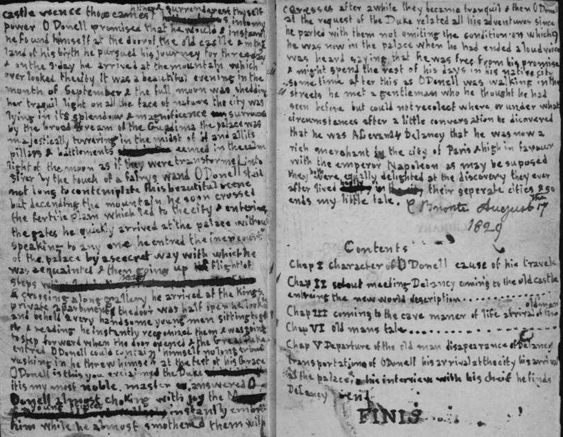 When the old man had finished his tale O'Donell and Delancy thanked him for the relation adding at the same time that they had never heard anything half so wonderful then as it was very late they all retired to rest next morning O'Donell awoke very early and looking round the cave he perceived the bed of leaves on which the old man had lain to be empty the rising he went out of the cave the sky was covered with red fiery clouds except those in the east whose edges were tinged with the bright rays of the morning sun as they strove to hide its glory with their dark veil of vapours now all beauty and radiance by the golden line of light which sreaked their gloomy surface beneath this storm portending sky and far off to the westward rose two tremendous rocks whose sumits were enveloped with black clouds rolling one above another with an awful magnificence well suited to the land of wilderness and mountain which they canopied gliding along in the air between these two rocks was a chariot of light and in the chariot sat a figure the expression of whose countenance was that of the old man armed with the majesty and might of a spirit O'Donell stood at the mouth of the cave watching it till it vanished and then calling Delancy he related the circumstance to him |[8]| some years after this ALexander went out one morning in search of the fruit on which they subsisted noon came and he had not returned evening and still no tidings of him O'Donell began to be alarmed and set out in search of him but could no where find him one whole day he spent in wandering about the rocks and mountains and in the evening he came back to his cave weary and faint with hunger and thirst days weeks months passed away and no Delancy apeared O'Donell might now Be said to be truly miserable he would sit on a rock for hours together and cry out ALexander ALexander but receive no answer except the distant echoing of his voice among the rocks sometimes he fancied it was another person answering him and he would listen ernestly till it dyed awey then sinking into utter despair again he woul sit till the dews of night began to fall when he would retire to his cave to pass the night in unquiet broken slumbers or in thinking of his beloved commander whom he could never see more in one of these dreadful intervals he took up a small parcel and opening it he saw lying before him two locks of soft culy hair shing like—burnished gold he gazed on them for a little and thought of the words of those who gave them to him—take this then that you may rember us when you dewll with only the wild beast of the desert and the great eagle of the mountain he burst into a flood of tears he wrung his hands sorrow and in the anguish of the moment he wished that he could once more see them and the mighty Warrior King their father if it cost him his life just at that instant a loud clap of thunder shook the roof of the cave a sound like the rushing of the wind was heard and a mighty genius stood before him I know thy wish cried he with a loud and terrible voice and I will grant it in 2 months time thou returnest to the castle wence thou camest hither and surrenderest thyself into my power O'Donell promised that he would and instantly he found himself at the door of the old castle and in the land of his birth he pursued his journey for three days and on the 3. day he arrived at the mountain which overlooked the city it was a beautiful evening in the month of September and the full moon was shedding her traquil light on all the face of nature the city was lying in its splendour and magnificence surrounded by the broad stream of the Guadima the palace was majestically towering in the midst of it and all its pillars and battlements eemed in the calm light of the moon as if they were transformed into siver by the touch of a fairys wand O'Donell staid not long to contemplate this beautiful scene but decending the mountain he soon crossed the fertile plain which led to the city and entering the gates he quickly arrived at the palace without speaking to any one he entred the iner court of the palace by a seecret way with which he was acquainted and then going up a flight of steps and crossing a long gallery he arrived at the Kings private apartment the door was half open he looked and beheld 2 very handsome young men sitting together and reading he instantly recgonized them and was going to step forward when the door opened and the Great Duke entred O'Donell could contain himself no longer but rushing in he threw himself at the feet of his Grace O'Donell is this you exclaimed the Duke it is my most noble master answered O'Donell almost choking with joy the young princes instantly embraced him while he almost smothered them with |[9]| caresses after a while they became tranquil and then O'Donell at the request of the Duke related all his adventures since he parted with them not omiting the condition on which he was now in the palace when he had ended a loud voice was heard saying that he was free from his promise and might spend the rest of his days in his native city sometime after this as O'Donell was walking in the streets he met a gentleman who he thought he had seen before but could not recolect where or under what circumstances after a little conversation he discovered that he was ALexander Delancy that he was now a rich merchant in the city of Paris and high in favour with the emperor Napoleon as may be suposed they both were equally delighted at the discovery they ever after lived hapily in their seperate cities and so ends my little tale.