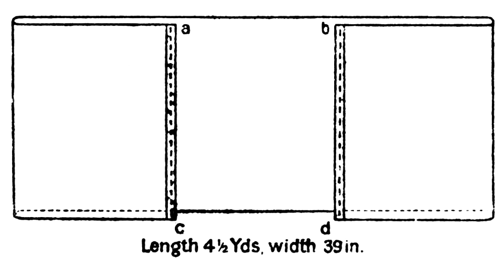 The method of draping is as follows: Tie a waist cord; take the corner b and fix it to the right-hand side of waist, then pass the edge b-a across the front of waist, round the left side towards the back, and round the back of waist again to the right side; now take up some pleats in the drapery and push them inside the waist cord in centre front of waist, then pass on the drapery round the waist to back and round to the right side again. Now catch up all the remaining drapery and throw it upwards across the chest over the left shoulder. Let the corner c hang down the back, and bring the corner around towards the front of waist and tuck it in at the left side of waist, so that it will have the thrown-over portion to the right of it. This completes this draping of an Indian sari. The width of this sari will drape a figure of 5’ 4”, most of those worn by Indian women are narrower.{41}
