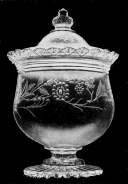 Much old English and Irish glass was contemporaneously sent to the American market, and the following articles were advertised as on sale at New York in the year 1773: “Very Rich Cut Glass Candlesticks, Cut Glass Sugar Boxes and Cream Potts, Wine, Wine-and-Water Glasses, and Beer Glasses, with Cut Shanks, Jelly and Syllabub Glasses, Glass Salvers, also Cyder Glasses, Orange and Top Glasses, Glass Cans, Glass Cream Buckets and Crewets, Royal Arch Mason Glasses, Globe and Barrel Lamps, etc.” The “etc.” would be capacious; it would include most of the articles mentioned in the paragraph just preceding this, and such things as crystal globes to be filled with water through which a candle might throw and condense its rays, for sewing or lace-making purposes, at night.