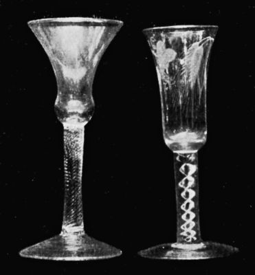 Many glasses, drawn, bell, or waisted-bell shape in bowl and baluster, plain round, air spiral, cotton-white spiral, or cut in stem, exist, which appear to have been used for the very strong ale then brewed; often these are engraved with representations of hops and barley.
