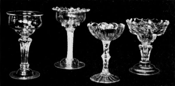 If you place near each other, upon a white damask cloth, a glass of Charles II date, a William and Mary glass, a George III glass, and a Victorian glass, you will notice a darkening and then a whitening in tint (though not a brightening) as your eye travels from the oldest glass to[16] the most modern. By “tint” or “tinge” I do not mean “colour,” in the sense of red or green or blue; I will deal with coloured glass later on. By “tint” or “tinge” I mean the shade of leaden, darkish hue in the metal from which the glass article was blown or moulded. This tint or tinge was inherent in the molten glass, before shaping and cooling began. The metal or raw material was mixed according to recipe—each glassworks had its own recipe—and one of the materials was lead. The older the Georgian glass, the more impure the metal—that is, the fuller of lead oxides—and therefore the darker; what are called improvements in glass-mixing have gradually eliminated the oxides, and therefore the leaden tint or tinge also; it is astonishing how many different shades and tinges of darkness (in that sense) a cabinet of old glass can show. In a few glasses the bowl is pale sapphire or aquamarine colour, the stem being the tint of plain glass.