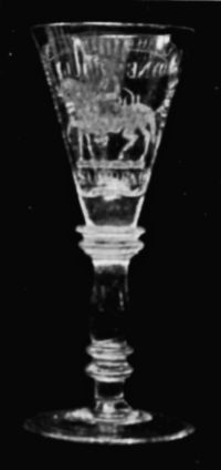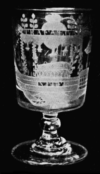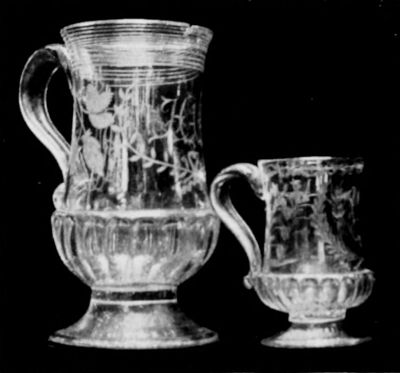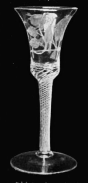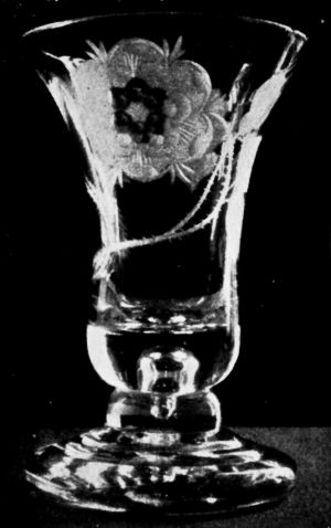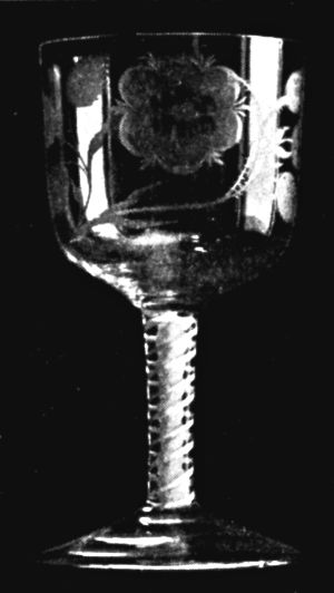 Perhaps the first glassware was cast, or moulded, and there is no record of when or where the blow-pipe was first used. Ancient glass beads were probably made by moulding: probably the first glass ever made in England (the windows at Wearmouth Church, in A.D. 675) was cast. Not until the sixteenth century,[27] apparently, was any blown glass made in England, and none of it remains both extant and intact; collectors are fortunate who come upon a piece of date so early as the first half of the seventeenth century, even; but from the last few years of the seventeenth century to the first few years of the nineteenth century inclusive, English and Irish blown glass was the best in the world. Therefore it is the blown pieces which are the most characteristic, whether blown only or blown and afterwards engraved or cut. And the blown pieces, being intended for use, are the more numerous, and the more readily collected; the cut and engraved pieces, being for ornament, were more costly, and therefore fewer—though perhaps they have been more carefully preserved.