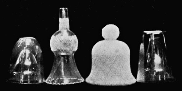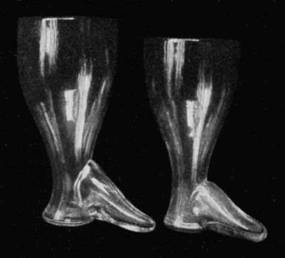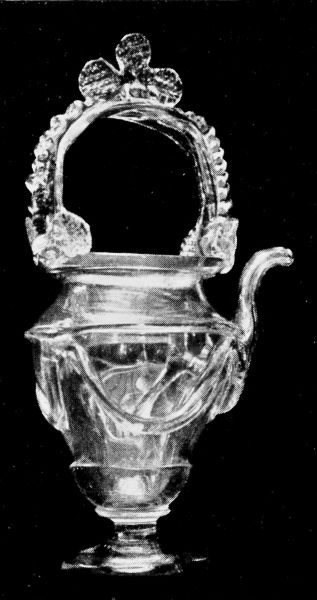The number and diversity of old glass articles may be indicated by the following incomplete list: wine glasses, beer glasses, cider glasses, rummers, cordial glasses, liqueur glasses, tumblers, firing glasses, coaching glasses, fuddling glasses, beakers, mugs, tankards, champagne glasses, grog glasses, Masonic glasses, goblets, Joey glasses, “boot” glasses, “yards of ale,” toy glasses; flasks, decanters, trays and waiters; punch or salad bowls, trifle bowls; wine bottles, spirit bottles; jugs, punch-lifters, decanter stands; jelly glasses, custard glasses, flip glasses, syllabub glasses; fruit[7] baskets, centre-pieces, sweetmeat glasses, captain glasses, comports or sweetmeat glass stands, epergnes, tazzas; salt cellars, sugar castors, pepper boxes; caddy sugar bowls; lamps, lanterns, chandeliers, candlesticks, nightlight glasses, taper holders; finger bowls, wine coolers; oil bottles, vinegar bottles, mustard bottles; jars, pickle jars; tea trays, preserve pots; vases, covered vases; rolling-pins, knife rests, knife and fork handles, spoons, sugar crushers; butter pots, celery glasses; weather glasses, chemical glasses, eye baths, witch-balls, porringers, posset vessels, holy-water vessels; door-stops, paper-weights; mirrors, knobs, glass pictures, bellows-shaped flasks, lustres, paste jewels, beads, taws, toy birds, animals, tobacco pipes, bellows on stands, walking-sticks, rapiers, and other elaborate baubles and oddities made for ornament or as tours de force. There seems to have been a Glass-makers’ Festival held at Newcastle some hundred years ago, and it was for exhibition then[8] that most of the freak glass toys and ornaments were made.