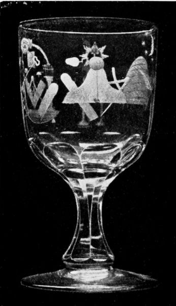 Much old English and Irish glass was contemporaneously sent to the American market, and the following articles were advertised as on sale at New York in the year 1773: “Very Rich Cut Glass Candlesticks, Cut Glass Sugar Boxes and Cream Potts, Wine, Wine-and-Water Glasses, and Beer Glasses, with Cut Shanks, Jelly and Syllabub Glasses, Glass Salvers, also Cyder Glasses, Orange and Top Glasses, Glass Cans, Glass Cream Buckets and Crewets, Royal Arch Mason Glasses, Globe and Barrel Lamps, etc.” The “etc.” would be capacious; it would include most of the articles mentioned in the paragraph just preceding this, and such things as crystal globes to be filled with water through which a candle might throw and condense its rays, for sewing or lace-making purposes, at night.