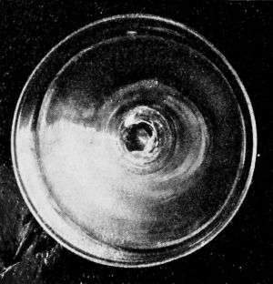 In the oldest glass the pontil-hole is flaked with something which rather resembles mica. In the oldest wine glasses the pontil-lump stands out knobbily. In every case there are signs of the local fracture. As a rule, the older the glass the bigger and rougher the pontil-mark.