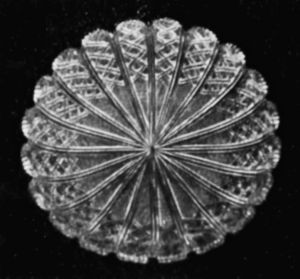 The Stourbridge glass-cutters, on the other hand, rather over-did and abused the deep, regular, machine-like repetition of the “diamond” and the “hob-nail” and the “pomegranate.” Sometimes, however, the cutting was flat and flowing, and a festoon-like, hung-tapestry-like form may be seen.