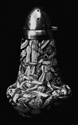 But the hunter may come upon pieces which came into existence before Queen Anne died: Jacobean glass, of the reign of Charles II at latest, is occasionally found. For a guinea I obtained a fine sacramental vessel in purfled and wreathed glass bearing the symbol of the Trinity (see next page); for 5s. a pistol-shaped scent bottle; and for 12s. 6d. a hand lamp, all three of Jacobean date.