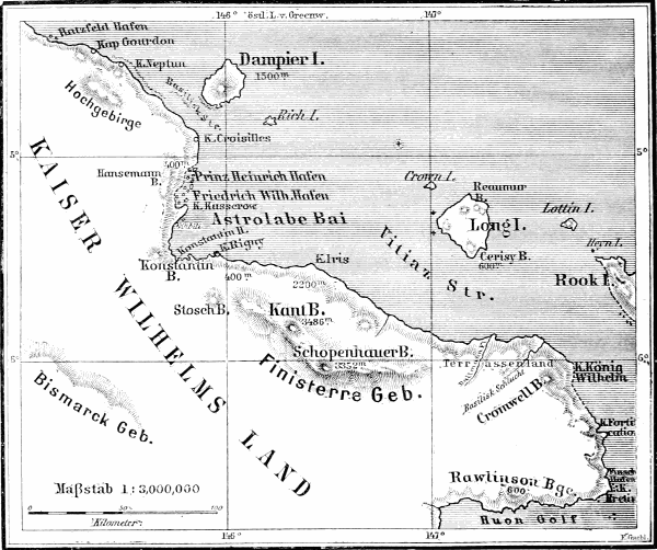Bald nach der Heimkehr von meiner fast vierjährigen Südseereise (Ende 1882) an den Vorarbeiten mitwirkend, wurde mir 1884 der ehrenvolle Auftrag, die inzwischen zur Reife gediehenen Pläne auszuführen, als Leiter einer ersten Untersuchungs-Expedition. Zu dem Zwecke war per Kabel in Sydney der britische Schraubendampfer »Sophia Ann« erworben worden, welcher unter der neuen Flagge den Namen »Samoa«[1] erhielt. Zur Führung desselben konnte ich einen erprobten Vertreter unserer Handelsmarine empfehlen, den Kapitän Eduard Dallmann aus Blumenthal bei Bremen, rühmlichst bekannt durch seine glücklichen Fahrten als Whaler im Pacific, wie in unbekannten Gewässern des arctischen und antarctischen Ozeans. Der vielerfahrene Schiffer bewährte auch auf diesen Reisen seinen alten Ruf, und wenn die »Samoa« mancherlei Fährlichkeiten, an riffreichen unbekannten Küsten, entging, so ist dies, wie die Erfolge der Expedition überhaupt, der geschickten und vorsichtigen Führung von Kpt. Dallmann zu danken[2]. Mit ihm langte ich am 29. Juli (1884) in der Hauptstadt von Neu-Süd-Wales an, wo unser erster Besuch natürlich der Samoa in Johnsons Bai galt. Da der Dampfer bisher Passagierdienst versehen hatte, mußten mancherlei Veränderungen vorgenommen werden, so daß wir erst am 11. September Sydney[S. 7] verlassen konnten. Nachdem wir zunächst Mioko, in der Herzog-York-Gruppe (Neu Lauenburg) erreicht und hier das schwer beladene Schiff von Vorräten erleichtert hatten, waren wir endlich so weit, um mit den eigentlichen Zwecken und Zielen der Expedition zu beginnen. Sie gipfelten in den folgenden Hauptpunkten: »Untersuchung der unbekannten oder weniger bekannten Küsten Neu Britanniens, sowie der Nordküste Neu Guineas bis zum 141. Meridian, um Häfen ausfindig zu machen, mit den Eingeborenen freundlichsten Verkehr anzuknüpfen und Land im weitesten Umfange zu erwerben«. Diesen, gewiß nicht ganz so leichten Aufgaben ist, soweit es Mittel und Umstände erlaubten, nach besten Kräften entsprochen worden. In Zeit von neun Monaten unternahmen wir sechs Reisen nach Neu Guinea, dampften längs des größten Teiles der Nord- und Südküste Neu Britanniens und besuchten Neu Irland vier mal. Von den nahezu tausend Meilen Küste, welche die Samoa, allein in Neu Guinea befuhr, gehörten nur 260 Meilen zu den besser bekannten. Aber eine fast ebenso lange noch unbekannte Strecke konnte als frei für Schiffahrt, für letztere außerdem sieben Häfen und ein schiffbarer Strom, nachgewiesen werden. Ausgedehnte Striche fruchtbaren Landes, für Kulturen, Viehzucht, wie Ansiedelung überhaupt geschickt, wurden aufgefunden, zum Teil gleich erworben und überall mit den Eingeborenen friedlicher und freundlicher Verkehr eröffnet. Als daher deutsche Kriegsschiffe Anfang November 1884 im Archipel von Neu Britannien im Namen Seiner Majestät des deutschen Kaisers die Reichsflagge hißten, konnten sie diesen feierlichen Akt auch gleich in Neu Guinea vollziehen. Die weitere Entwickelung ist bekannt. Wie zu erwarten, einigten sich Deutschland und Großbritannien über die Grenzen, und »Kaiser Wilhelms-Land« und der »Bismarck-Archipel« gingen laut Kaiserlichen Schutzbrief vom 17. Mai 1885 in die Verwaltung und den Besitz der »Neu Guinea Kompagnie« in[S. 9] Berlin über. Diese neuen Schutzgebiete, die später noch durch einige der westlichen Salomons-Inseln Zuwachs erhielten, umfassen (ohne die letzteren) ein Areal von 231,427 qkm (= 4203,13 d. g. ☐M.), repräsentieren daher ein respektables Besitztum, wenig kleiner als die alten Provinzen des Königreichs Preußen (ohne Schlesien).