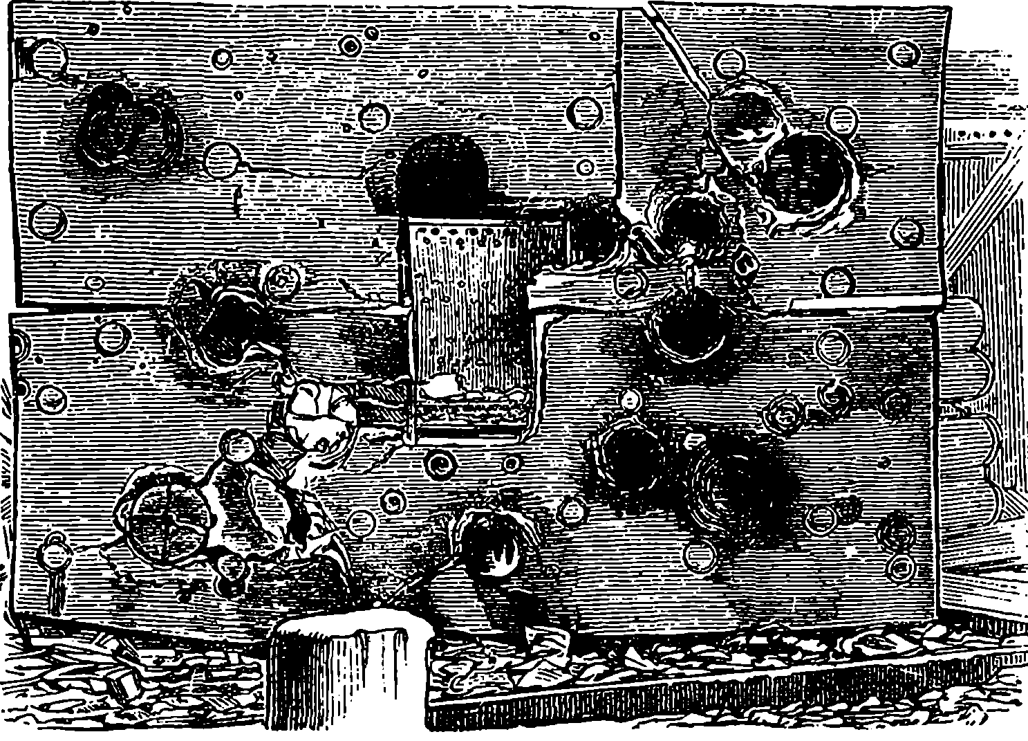 Dr. Joule arranged paddles of brass or iron, so that they could turn freely in a circular box containing water or quicksilver. From the sides of the box partitions projected inwards, which contained openings that permitted the divided arms of the paddle to pass, and preventing the liquid from 805moving en masse, thus caused a churning action when the paddle was turned. Now, every one who has worked a rotatory churn knows that a considerable resistance is offered to this action; but every one does not know that under these circumstances the liquid becomes warmer. It was Dr. Joule’s object to discover how much the temperature of his liquid was raised by a measured quantity of work. He used very delicate thermometers, and had to take a number of precautions which need not here be described; and he obtained the definite quantity of work by the descent of a known weight through a known distance, a cord attached to the weight being wound on a drum, which communicated motion to the paddle. The experiments were conducted with varying circumstances, to avoid chances of error, and were repeated very many times until uniform and consistent indications were always obtained. The result of the experiments showed that 772 units of work (foot-pounds) furnished heat which would raise the temperature of 1 lb. of water from 32° to 33° F., which is the unit of heat. This number, 772, is a constant of the greatest importance in scientific and practical calculations, and is called “the mechanical equivalent of heat.” The amount of work it represents is sometimes called a “Joule,” and is always represented in algebraical formulæ by “J.” Mr. Joule’s first paper appeared in 1843, and soon afterwards various branches of the subject of “The Equivalence and Persistence of Forces” were taken up by a number of able men, who have advanced its principles along various lines of inquiry. Among the most noted contributors to this question we find the names of Sir William Thomson, Helmholtz, James Thomson, Rankin, Clausius, Tait, Andrews, and Maxwell.