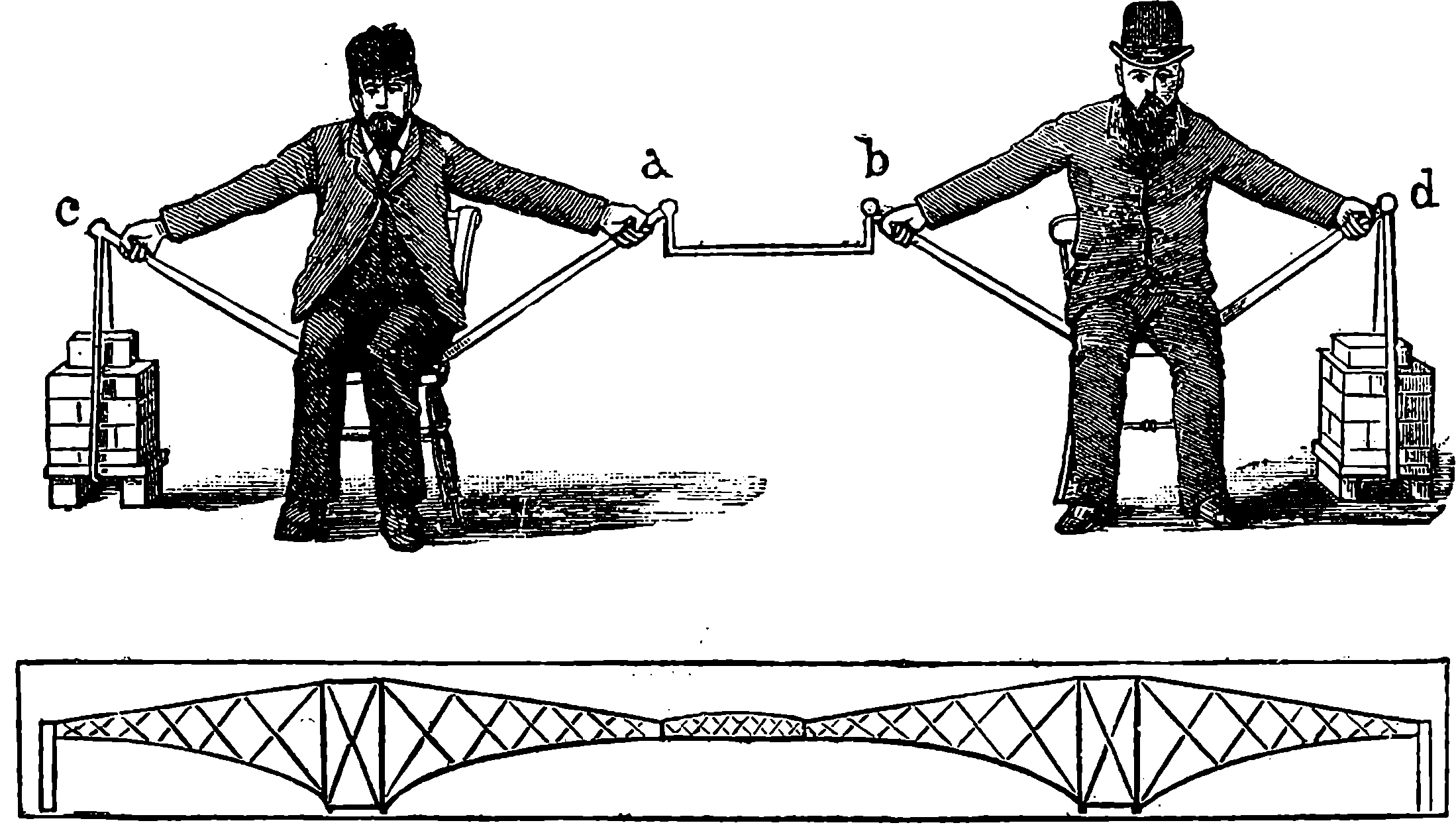 The statement here should have been more explicit, as it has reference to a state of things not to be realised in practice. Like the well-known “first law of motion,” it can neither be demonstrated à priori, nor proved by any direct and simple experiment. The first law of motion asserts that a body in motion, not acted on by any external force, will continue to move in a straight line, and with a uniform velocity. Now we cannot place a body in such a position that it will not be acted upon by some external forces; but the more we lessen the effect of external forces, the more nearly is the motion straight and uniform. Similarly in the case supposed, the intention is to show that the weight carried up is in a position to do just as much work as was done upon it. We must suppose several impracticable but conceivable conditions in order to eliminate considerations which do not concern the theoretical question; we must suppose the cord to be weightless and absolutely devoid of rigidity; the pulley to have no mass or inertia, that is to require no force to set it in motion, and to move without any friction; the air to offer no resistance; and the force of gravity to be uniform throughout the space. Some approximation to these conditions is practicable, as, for example, the pulley might be the lightest possible, and turn on friction wheels, the cord might be the finest silk thread, and so on. But it is not the influence of these external forces we are considering, but only the energy due to the position of the raised weight. Assuming, therefore, the disturbing conditions absolutely eliminated, it is not difficult to see that no downward force or pressure, however small, could be applied for ever so short a time, to the upper weight without setting the system in motion. The motion would be an accelerated one so long as the force was applied, it would become uniform when the force ceased to act; it would have a velocity proportionate to the force. In any case, after a time the descending weight would reach the ground, and for our point of view it is quite immaterial whether the time occupied by the movement were 5 minutes or 5,000 years, for be it observed, time does not enter into the definition of work as it does into that of “horse-power.” Then by pushing the conceived conditions to their limits, we may see that without considering any question of conversion of motion into heat, the raised weight can, in theory at least, give back again the energy spent upon it.