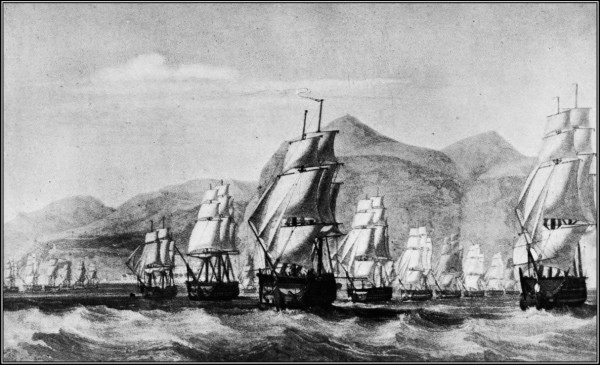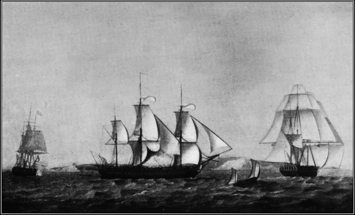 The Hon. East India Co.’s Ship General Goddard with H.M.S. Sceptre and Swallow capturing Dutch East Indiamen off St Helena |