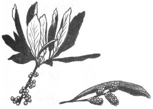 No doubt the Bayberry is familiar to you. Wax from its berries has long been used to make candles, and you may wish to take some berries home to try your hand at this. Boiling them will cause the wax to float on the water. Dip a piece of string (wick) to collect it.