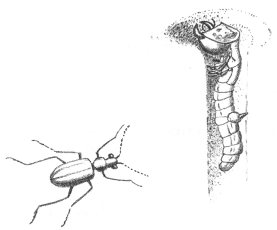 Walking through the dunes, you will frequently notice a small hole in the sand. Poke a blade of grass into it and you will find the hole quite deep. As a matter of fact, it may extend down two feet. This hole is made by the Sand 7 Dune Wolf Spider (Lycosa pikei) to provide a home where the female may raise her young. Wolf Spiders are a species that elsewhere carry their young on the back and hunt down their food wolf fashion, not even taking time to construct a web. On the exposed dunes, the Sand Dune Wolf Spider protects its young in this hole far beneath the ground.