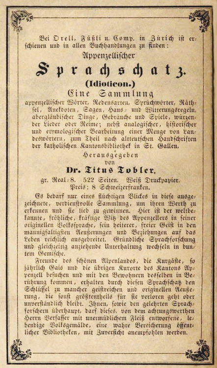 Freunde des schönen Alpenlandes, die Kurgäste, so jährlich Gais und die übrigen Kurorte des Kantons Appenzell besuchen und mit den Bewohnern desselben in Berührung kommen, erhalten durch diesen Sprachschatz den Schlüssel zu mancher geistreichen und originellen Aeußerung, die sonst größtentheils für sie verloren geht oder unverständlich bleibt. Ihnen, sowie den gelehrten Sprachforschern überhaupt, darf dieses, von dem achtungswerthen Herrn Verfasser mit unermüdlichem Fleiß entworfene, lebendige Volksgemälde, eine wahre Bereicherung öffentlicher Bibliotheken, mit Zuversicht anempfohlen werden.