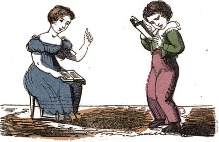 John is a sad boy. He will not learn to read, though Jane takes so much pains to teach him. See how the leaves of his nice, gay book are all torn, and how he pouts his lips. We hope, as he grows up, he will see his faults, and try to mend.