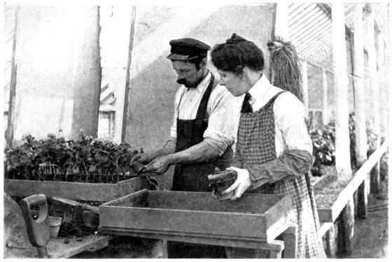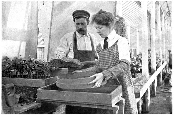 Tools: There is always a tendency among beginners to overload with the paraphernalia of their calling, whatever it may be. When the first enthusiasm passes, and one becomes a careful and successful worker, all that is superfluous is gradually dropped, and one realises that it is brains and not tools that make the successful gardener. A hotbed, a cold-frame or two, a work-table in some convenient place, a trowel, wheel-barrow, spade, pitchfork, rake, hoe, a few yards of stout cord, a hatchet to sharpen stakes, a watering-pot, rubber sprinkler, rubber gloves, a good supply of pots and wire-netting, and a couple of good mole-traps cover the real necessaries. Incidentals, such as wire-sieves, lath-screens, trellises, and the like, may be made as they are required.