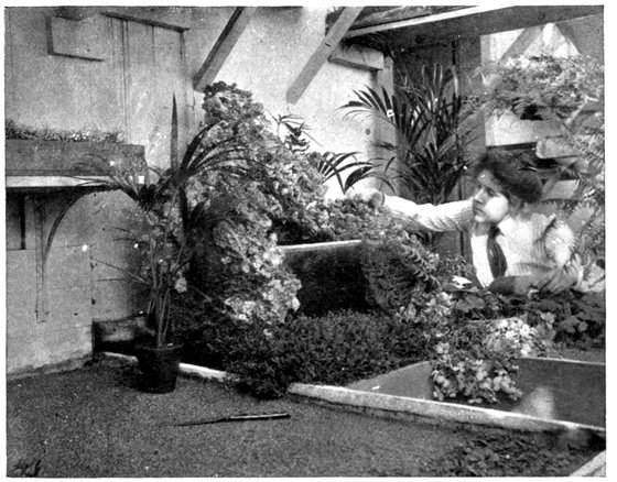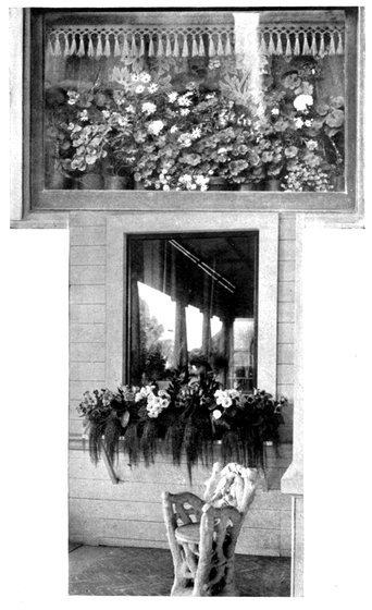 An excellent place for Begonias, Gloxinias, and other shade-loving plants is made by fitting a wide 246shelf under a north or east window on the outside, with a raised edge three or four inches high, made by tacking strips of wood across the front and ends. Inclose with window-netting, first nailing strips of wood from the outer corners of the shelf to the upper corners of the window-casing to support the netting. When the shelf is filled with wet sand, and the plants plunged in it, one has a miniature greenhouse accessible from the room, and safe from trespass of chickens, cats, or careless feet. The shelf may extend considerably beyond the window-casing if desired, and be made attractive from the outside by climbing vines. The Maurandya is fine here, as it will push its tips through the netting, and be very ornamental; the Asparagus tenuissimus and A. plumosus nanus are also good. A couple of plant-brackets fastened to the outside casing will afford room for drooping plants, and add to the attractiveness of the shelf. Primroses will bloom here all summer, and Ferns, Gloxinias, and fancy-leaved Caladiums find a congenial home.