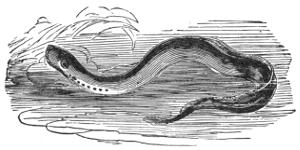 One of the various hoverer-flies is shown on plate J, fig. 9. The larva of this insect is very remarkable, on account of its curious breathing apparatus. The larva is properly called the Rat-tailed Maggot, and is shown on the same plate, fig. 8 a. The body of the creature is found buried in the mud at the[173] bottom of stagnant pools or cisterns, and the respiration is carried on through the telescopic tail, which is long enough to protrude through the mud, and to convey the necessary oxygen to the system through two flexible air-tubes that pass through the “tail”.