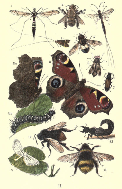 Mention has already been made of the little Ichneumon fly. One of these insects is shown magnified on plate J, fig. 12 a, and one of the large species is depicted on plate H, fig. 3. The threefold appendage to the tail is the ovipositor, or instrument by means of which they pierce their victims and deposit their eggs.