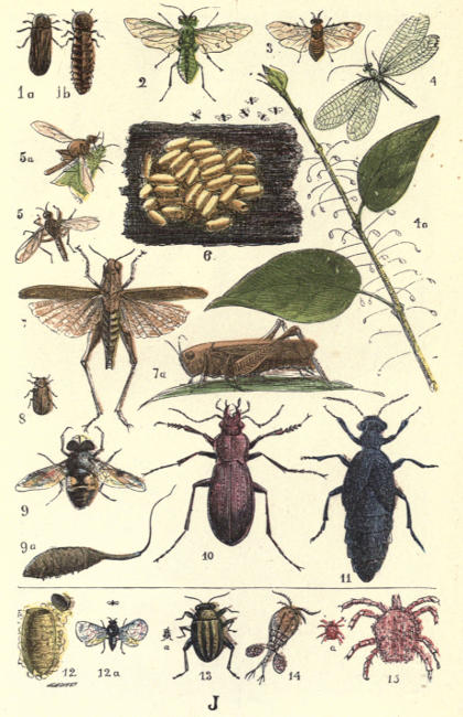 On the same plate, fig. 11, is seen the Oil-beetle, an eccentric kind of insect, which, when frightened, pours a drop of oil out of every joint, just as if it were a walking oil-barrel with self-acting taps.
