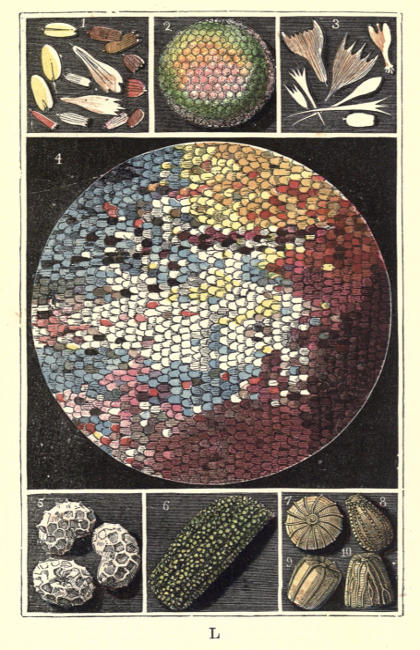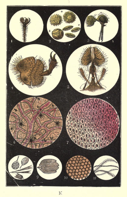 Various shells are drawn on one or two of the plates, but there is not space for any description. Their names may be found on the Index to Plates. Plate G contains certain fungi and mosses. Fig. 1 is that peculiar plant which reindeer scrape from under the snow in the winter time. Fig. 2 was once dreaded by rustics as “Witch’s butter”. Fig. 6 shows the curious Earth-star, chiefly remarkable for its resemblance to the marine Star-fish.