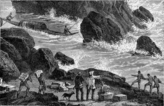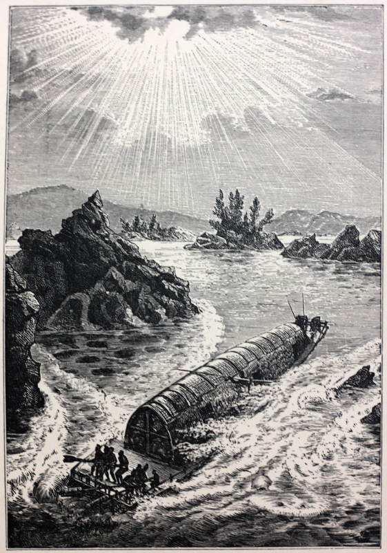 At length the voyagers came within hearing of the tremendous roar of the Khon cataract. Their boatmen, brisker than on ordinary occasions, hauled or propelled their vessels through a very labyrinth of rocks, submerged trees, and prostrate trunks still clinging to earth by their many roots. They knew that their hard labour was nearly at an end, and that at Khon the expedition would dismiss them, as fresh boats would be required above the cataract. As for their homeward voyage, what was it? To ascend the river had been the work of a week; the swift current would bear them back in less than a day.