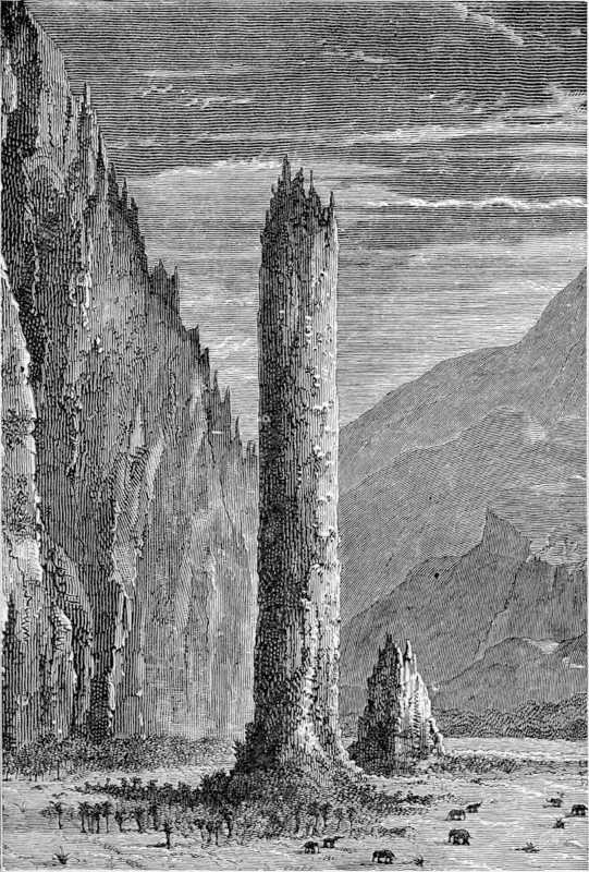 We cannot describe all the objects of interest at Lakon, or all the excursions which Garnier made in its neighbourhood. The geologist and botanist of the expedition adventured a visit to the Marble Mountains. With a guide and a couple of elephants, they crossed the river, plunged into the forest-depths, and found their way to the quarries, where blocks of marble are excavated for the purpose of being made into lime of a dazzling whiteness. Then they penetrated into the grottoes and caverns with which the mountains abound. As they advanced, the scenery became more and more picturesque, and more and more savage: high rugged peaks rose above the forest trees; bushes and lianas and parasitical plants decked with festoons every rocky projection; here yawned a gloomy chasm, there towered aloft a mighty and awful precipice. But the scene of scenes burst upon them after they had threaded a gloomy maze of trees and intertangled bamboos. Two immense walls of sombre rock, several hundred yards in height, enclosed a broad ravine, which, at[54] the further extremity, opened on a bare and shining plain. On the left, the wall extended to a great distance, forming a long line, decreasing in elevation through the natural effect of the perspective. That on the right towered above a pile of enormous rocks, heaped together in the wildest confusion; it seemed to turn like the enceinte of a strong fortification, and was terminated abruptly by a vertical line, broken by numerous gaps. Between these lofty barriers lay a barren plain; afar, some miniature pools glittered with a magical effect in the “pale moonlight.” The prospect was closed in the distance by the steep declivities of lofty mountains, surrounding and shutting up, as it were, this gigantic “cirque” or amphitheatre. About three hundred yards from the entrance rose two vertical rocks, like a couple of slender spires, or rather like two enormous tapers—rose to a prodigious height, isolated, and emerging from a clump of luxuriant verdure which flourished at their feet. One of these rocks was fully nine hundred feet in elevation. The other was not so lofty, and seemed to have partially fallen, the ground being everywhere strewn with its wreck.