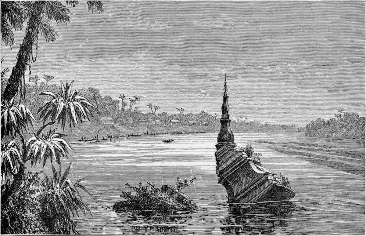 But we must no longer tarry at Lakon. We must once more launch the boats of our adventurous voyagers, and continue our exploration of the great river. It waters a populous country, and large towns are of frequent occurrence on its banks. We pass Hoûten, with its pagodas, its mountains, and green woods; Saniabury, with its rude pottery-manufacture; verdurous islands and shining sand[59][61]banks; and the mouths of the many streams which help to swell the abundant volume of the Mekong. From Saniabury the French expedition proceeded to Bouncang, a large and beautiful village at the mouth of the Nam San; thence to Nong Kay, where a Buddhist tat or pyramidal landmark, erected to indicate a sacred spot, or to enshrine a relic, has been washed away from the shore, and now lies half submerged, like a wrecked ship; and thence to Vien Chan, where the river widens into a channel of a thousand yards in width, before it enters the mountain region. Vien Chan, now a heap of ruins, was the former metropolis of the kingdom of Laos; and relics of antiquity spread over a considerable area testify to its ancient prosperity and splendour. The remains of the royal palace are interesting. It does not seem to have been built of very durable materials, the walls and staircases being faced with, and the pavement and flooring composed of, bricks, wood, or a kind of cement; but the entire structure still exhibits a certain elegance of character, and a remarkable wealth of decoration—the columns of wood have been tastefully carved and profusely gilded; and the whole is embellished with mouldings, and arabesques, and fantastic animal-figures.