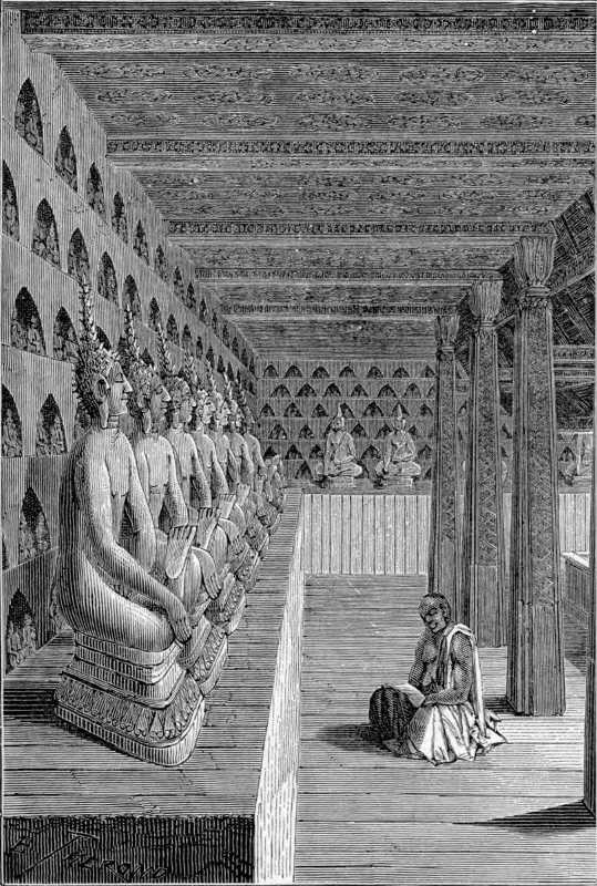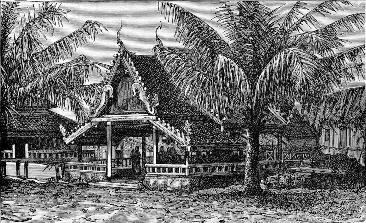 To the north, in the midst of the forest, is situated a smaller pagoda, which has undergone but little dilapidation,—that of Wat Sisaket. In its interior a number of small statues of Buddha are enshrined in gilded niches, which cover the wall from floor to ceiling, rivalling the terraces of Boro Bodor, the celebrated Buddhist monument of Java. Before the altar was elevated a candelabrum, remarkable for its originality of design and exquisite finish of workmanship. A few paces distant from the pagoda was situated the library, an indispensable appendage of all the temples of Laos; it was partly destroyed. As no native was near, the French explorers clambered up the worm-eaten pillars which supported and isolated from the soil the flooring of this literary tabernacle: in the interior some sacred books were scattered about; they were composed of[66] long narrow strips cut from the leaves of a particular species of palm, gilded on the edges, and stitched together in books. Each contained seven or eight lines of that rounded writing peculiar to the peoples of the Indo-Chinese peninsula; which differs, as is recognized at the first glance, from the writing of India properly so-called, though derived from it. A BUDDHIST MONASTERY. Finally, attached directly to the pagoda, the travellers found a rectangular gallery, opening internally on a court,—its walls covered, like those of the temple itself, with small niches containing Buddha statues. This was the vihara (chon-khon in Laotian), or monastery, which served as the residence of the priests ministering in Wat Sisaket.