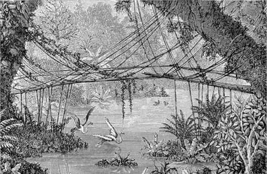 Storms of wind and rain contributed to render the voyage more wearisome and the progress slower. It was no easy task at night to find a secure haven for the boats; and the sudden floods of the little streams at the mouth of which the voyagers sought shelter, several times subjected them to the risk of being carried away during their sleep, and cast all unexpectedly into the mid-current of the great river. They slept on board their boats, because the roof was some protection from the furious rains; but these soon soaked through the mats and leaves of which it was composed. The weather was warm, and thus these douche-baths were not wholly insupportable; and when the voyagers could not sleep, they found some consolation in admiring the fantastic illumination which the incessant lightnings kindled in the gloomy arcades of the forest, and in listening to the peals of thunder, repeated by a thousand echoes, and mingling with the hoarse continuous growl of the angry waters.