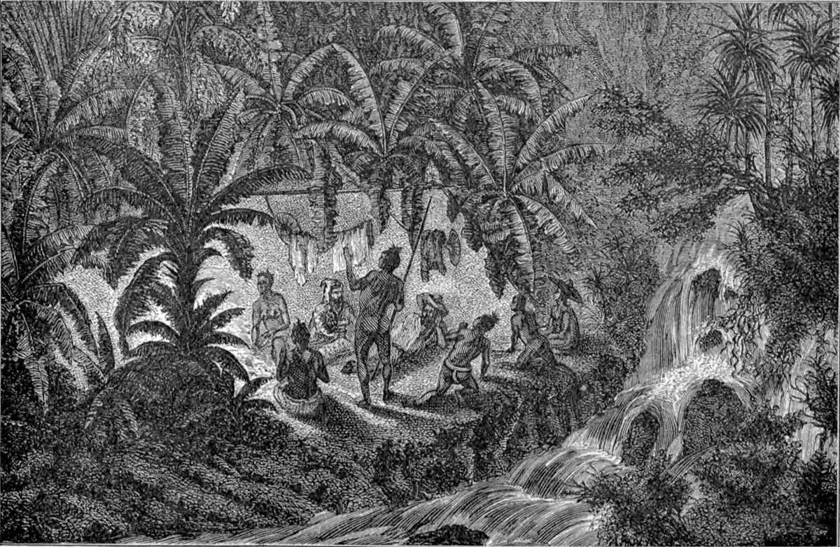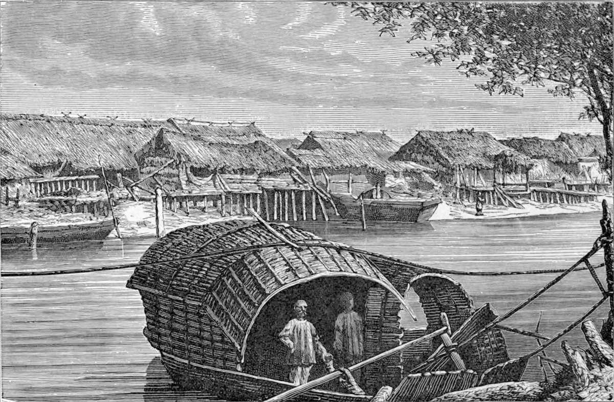 One evening, for example, they dropped anchor at the mouth of a small stream which, in foam and spray, came tumbling down from the mountains of Cambodia. After supper they lay down to rest on the mats which covered the deck of their vessels. Black was the sky, hot and oppressive the air; all around were visible the portents of a coming storm. The distant roar of the hurricane failed, however, to disturb the sleepers, who were spent and overcome with the fatigues of the day. But at last they were wakened effectually by a “thunder-plump,” which quickly flooded their canoes, and drove them upon deck.