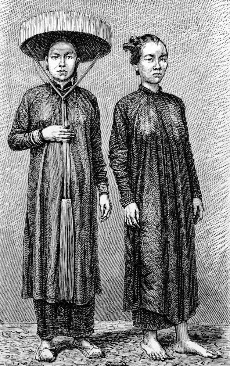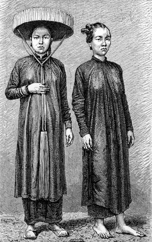 Lieutenant Garnier describes the Laotians as generally well made and robust. Their physiognomy, he says, is characterized by a singular combination of cunning and apathy, benevolence and timorousness. Their eyes are less regular, their cheeks less prominent, the nose straighter, than is the case with other peoples of Mongolian origin; and but for their much paler complexion, which closely approaches that of the Chinese, we should be tempted to credit them with a considerable admixture of Hindu blood. The male Laotian shaves his head, and, like the Siamese, preserves only a small tuft of very short hair on the summit. LAOTIAN COSTUME. He dresses himself tastefully, and can wear the finest stuffs with ease and dignity. He chooses always the liveliest colours; and the effect of a group of Laotians, with the brilliant hues of their costume set off by their copper-tinted skin, is very striking. The common people wear an exceedingly simple garb—the langouti, a piece of cotton stuff passed between the legs and around the waist. For those of higher[18] rank the langouti is of silk; and is frequently accompanied by a small vest buttoned over the chest, with very narrow sleeves, and another piece of silk folded round the waist as a girdle, or round the neck as a scarf. Head-gear and foot-gear are things little used in Laos; but the labourers and boatmen, when working or rowing under a burning sun, protect the head with an immense straw hat, almost flat, much like a parasol. Personages of high rank, when they are in “full dress,” wear a kind of slipper, which appears to inconvenience them greatly, and is thrown off at the earliest opportunity.