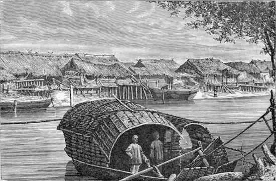 The Mekong was not at its full height at the time our voyagers ascended it: a great part of its bed lay bare; and a person, on landing, before he could reach the bank had to traverse wide spans rugged with rocks. Here and there spread immense sandbanks, on which were erected large fishing-stations—veritable towns of bamboo—already abandoned by the fishermen in anticipation of the quick-coming rise of the waters.