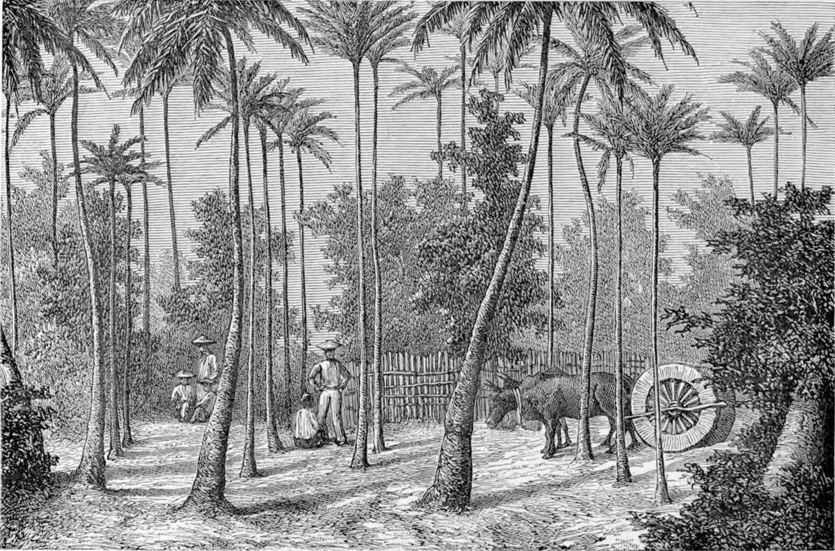 A day or two afterwards, Garnier and his friends, in returning from a walk in the environs of Lakon, encountered some Laotians carrying vessels of bamboo, filled with a liquid which at first they supposed to be water. On tasting it, however, they discovered that it was the wine of the country; sweet-flavoured, and by no means disagreeable to the palate; not unlike, indeed, the product of some of the Rhenish vineyards. It was palm-wine, freshly made; and to enjoy its bouquet and full flavour it should be drunk in this condition, for it will not keep more than four-and-twenty hours without fermentation. The Laotians offered to conduct the strangers to a neighbouring plantation, where they might observe the different processes of its manufacture. The offer was accepted, and the party soon[58] arrived at a clearing which was thickly planted with great borassus palms. HOW THE WINE IS COLLECTED. To collect the wine,—which is, in fact, the sap of the tree,—nothing more is necessary than to make an incision in the middle of the head of the tree, at the point where the leaves branch off, and suspend beneath a bamboo, into which the sap falls, drop by drop. In order to reach the summit of these huge palms, which are straight and smooth as the main-mast of a ship, the Laotians have invented a simple and ingenious process. They transform the palm into a veritable ladder, by attaching to the trunk, with small strips of flexible ratan, projecting laths of bamboo, which, jutting out to right and left at intervals of twelve to fourteen inches, form so many “rungs,” and enable the ascent of the tree to be rapidly and easily accomplished.