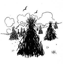 When the grain ripened, it was reaped by hand with the slender, saw-edged sickles. The peas and oats, which were sowed together, had to be mowed and gotten in; the flax had to be pulled and rotted; there was hoeing to be done, and the summer was full of work. In the fall the corn had to be cut and husked and the stalks brought in, the pumpkins and squashes gathered, potatoes dug, the haying finished, and the apples picked. Most farms had large orchards about them, and many barrels of apples were stowed away in the cellar, but the larger part was made into cider. There would usually be several little cider-mills in a town, whose creaking machinery could be heard on many a cool autumn day groaning under its labors. The shaking of the apple-trees and carting the fruit to mill, and the taking 17 copious draughts of the sweet liquid through a straw from the tub that received it from the press, and then the return with the full barrels—all this had more of the frolic in it than real work, particularly for the boys. The sweet apples, in large part, were run through the mill by themselves, and the cider was boiled down at home into a thick fluid known as apple-molasses, used for sweetening pies, sauce, and puddings. When harvesting was done, the cellar was full of vegetables in barrels and bins and heaps, and heavy casks of cider lined the walls, and little space was left for passageways. Even in broad daylight it was a place mysterious, gloomy, and dungeon-like; yet its very fulness which made it thus was suggestive of good cheer.