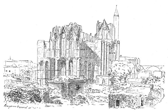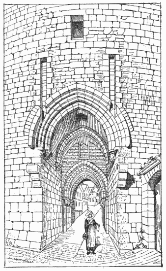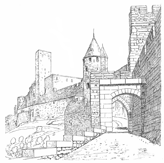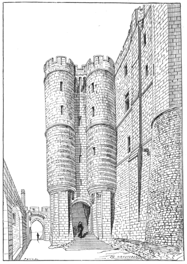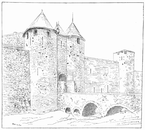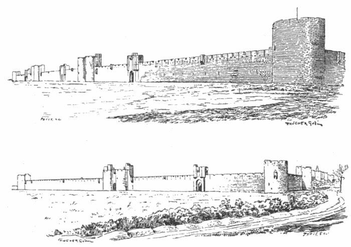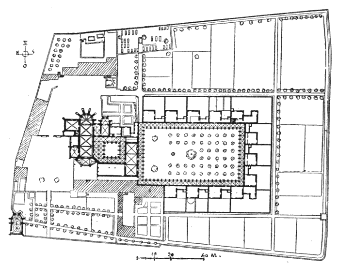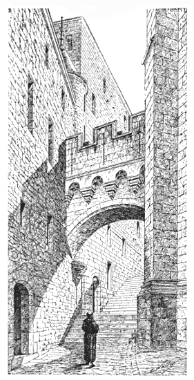 The whole building, which covers a very considerable area, was completed in less than sixty years. Its formidable mass was further strengthened by[387] the fortified enceinte of the town, some three miles in circumference.