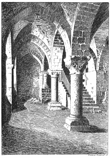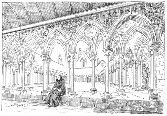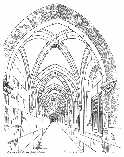 The canons' lodgings were also in close proximity to the cathedral, but on the side opposite to the bishop's palace. They were surrounded by an en[384]closure, the gates of which were fastened at night. It was the duty of the canons to aid the bishop in his ministrations. They lived together in annexes which communicated with the cathedral by means of galleries and cloisters.[74]