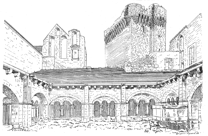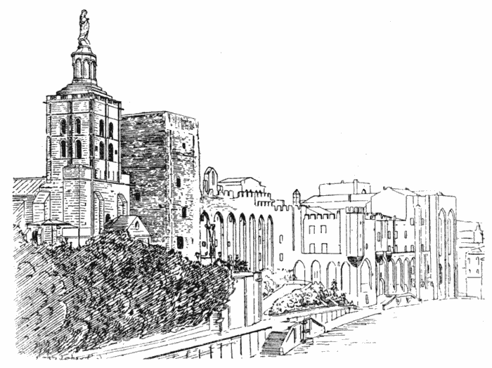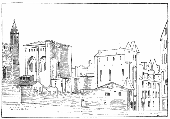 The Popes, having established themselves at Avignon in the fourteenth century, built a huge mansion on the rock known as the Rocher des Doms, which overlooks the Rhone. In 1336 Benedict XII., having destroyed his predecessor's palace, laid the foundations of the immense fortified pile now in existence. The plans were the work of the French architect, Pierre Obrier. The building was added to by the successors of Benedict XII., Popes Clement VI., Innocent VI., and Urban V., and was completed, or at any rate made efficient for defence, by 1398, when Pedro de Luna, who became pope under the title of Benedict XIII., sustained a memorable siege therein.