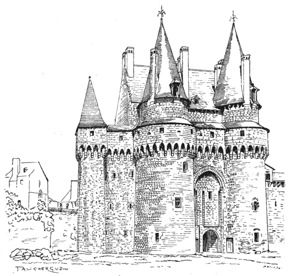 The gate-house of the hôtel de ville at Bordeaux, known as the grosse cloche, is an example of the[379] more ancient usage. Here we find the bell hung over the gateway, as already described. The belfry of Bordeaux, which appears to date from the fifteenth[380] century, is very remarkable. It consists of two towers connected by a curtain through which is an arched passage. A second arch protects the great bell in the upper story, and the whole is surmounted by a central roof, flanked right and left by the conical crowns of the lateral turrets.