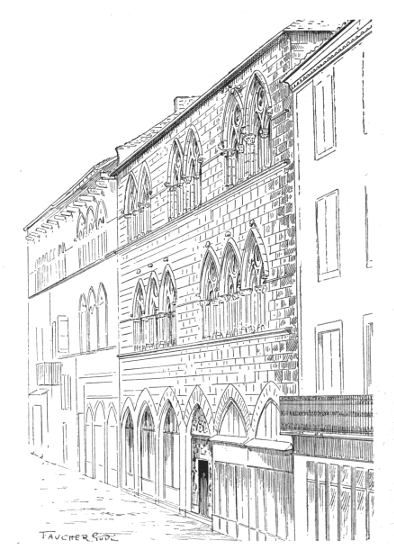 Markets, warehouses, and exchanges were often annexes of the town-halls. A few examples of such buildings have been preserved, but those of the third class are extremely rare. A specimen, remarkable both for construction and decoration, which recall the Spanish architecture of the fourteenth century, still exists at Perpignan. It is a house known as La Loge, built in 1396, which originally served as exchange to the cloth merchants of French Catalonia and Roussillon.