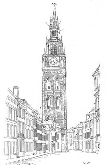 Belfries.—In the early days of the enfranchisement of the communes, it became customary to call the community together by means of bells, which at that period were confined to the church towers, and which it was unlawful to ring without the consent of the clergy. It may easily be conceived to what incessant broils the new order gave rise, the clergy as a body being strongly opposed to the separatist tendency of measures which attacked their feudal[373] rights. The municipalities finally put an end to internecine warfare in this connection by hanging bells of their own over the town-gates, a custom which was superseded towards the close of the twelfth and beginning of the thirteenth century by the erection of towers for the civic bells. Such was the origin of the belfry, the earliest material expression of communal independence.